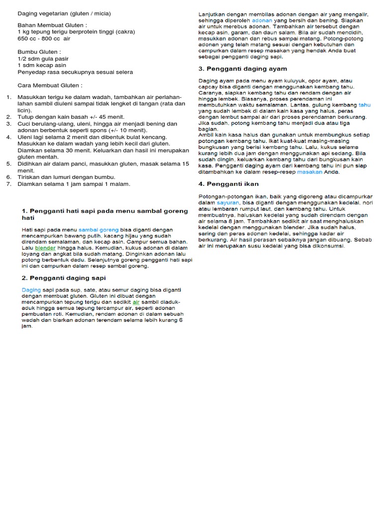Seitan ini terbuat dari gluten gandum yang patinya sudah dibersihkan sehingga menyisakan protein padatnya saja. Gluten ini bisa dijadikan seperti halnya lauk berikut ini merupakan cara untuk membuat resep masakan vegetarian yang bisa anda lakukan, pastikan sesuai dengan step by step di bawah ini. Masak dengan cara di tumis dengan bumbu pelengkap. Bagi orang yang tubuhnya tidak dapat menolerir gluten, sebaiknya tidak. 1 kg tepung terigu protein tinggi, air, garam.
